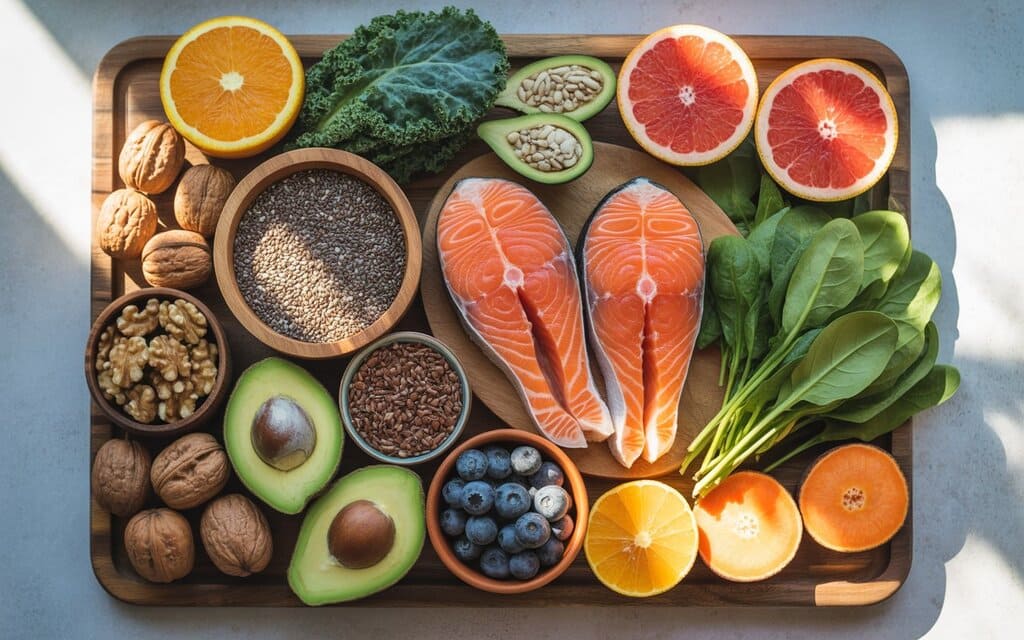 الأطعمة الغنية بأوميغا 3 والفيتامينات ومضادات الأكسدة.